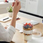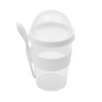 Jarro con compartimento superior y cuchara, fabricado en plástico PS con tapa de polipropileno y grip de silicona. Cuenta con domo transparente para cereales o toppings y cuchara incluida. Es ideal para desayunos saludables y prácticos fuera de casa, en la oficina o en viajes.