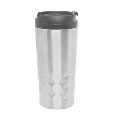 Ø 6,5 x 16 cm. Capacidad 250 ml. Metal y plástico. Mug con tapa. Exterior de metal con detalles en relieve, interior plástico. Tapa rosca en plástico. Base antideslizante.