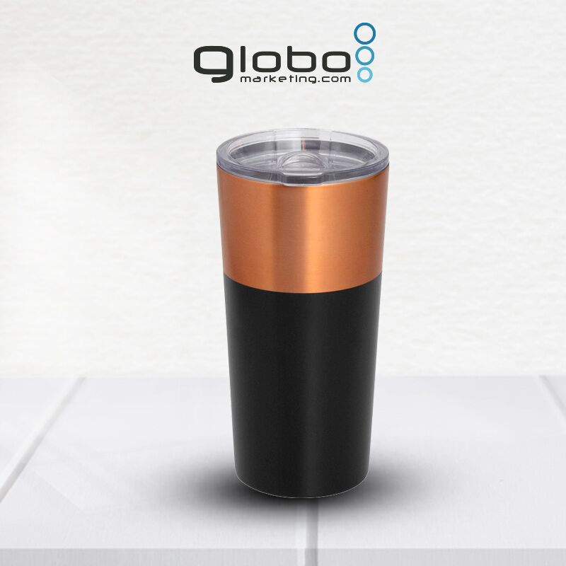 Tapa plástica transparente a presión con boquilla, seguro antivuelco y anillo de silicona antiderrame. Pintura exterior con acabado mate en color negro y cobre.