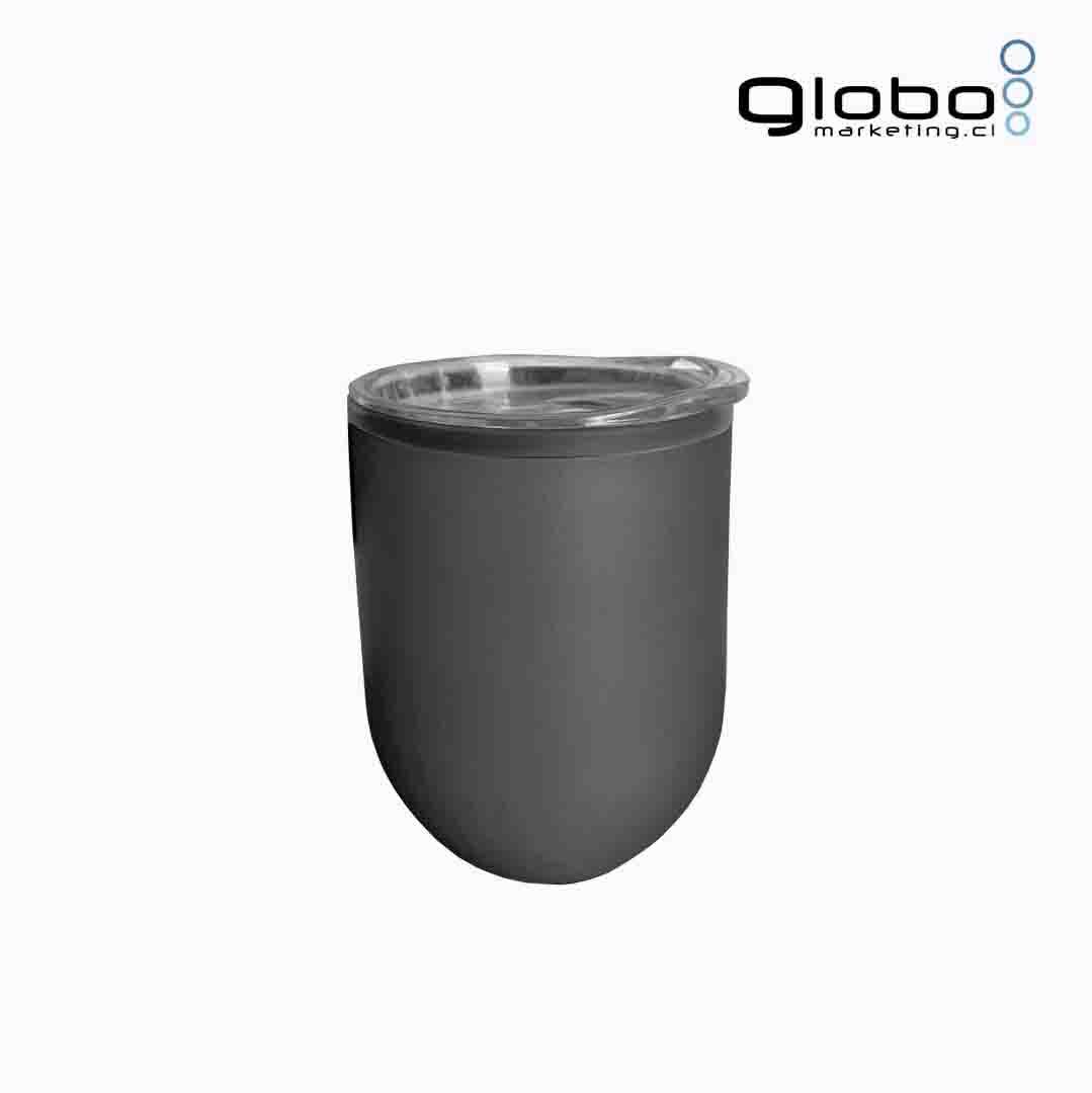Ø 8 x 11,5 cm. Capacidad 300 ml. Polipropileno y acero inoxidable. Doble Pared. Interior de plástico y exterior acero inoxidable 201. La pintura es resistente a golpes. Tapa transparente con seguro. Base antideslizante. La impresion destapa en color plata.
