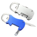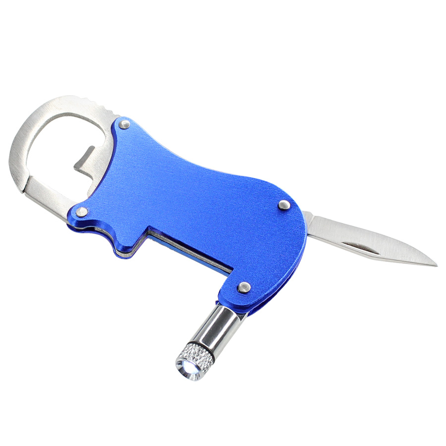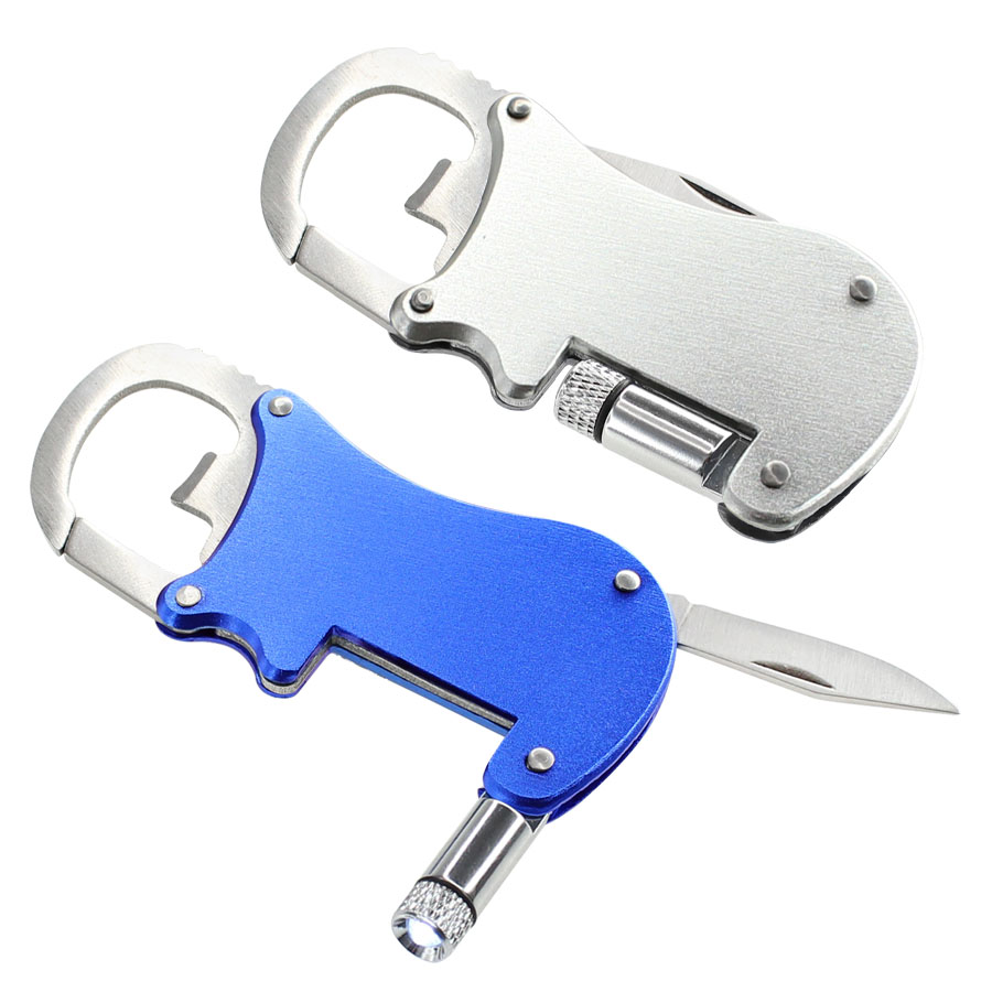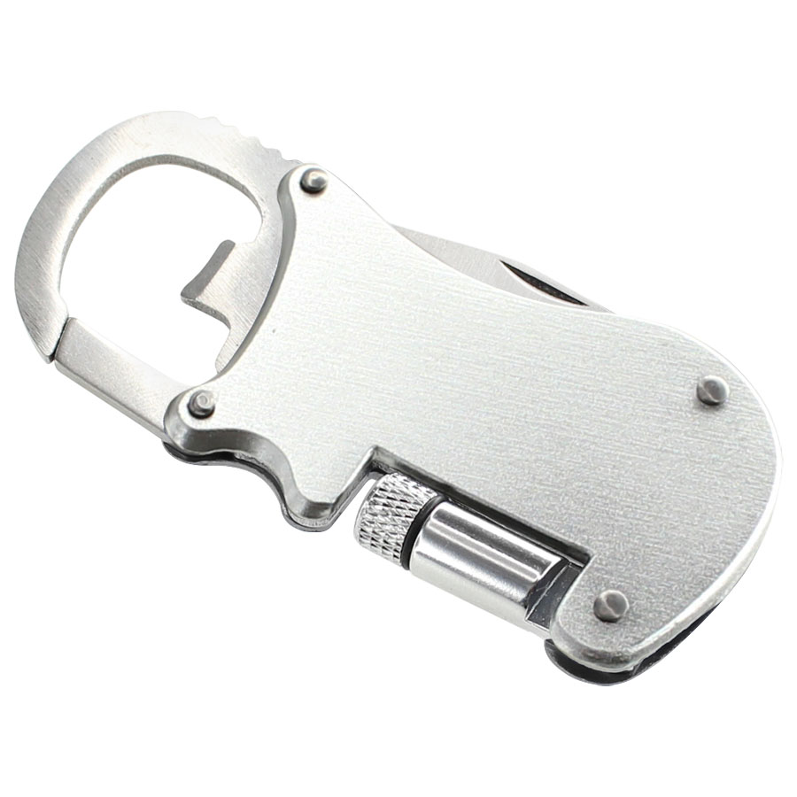 Multiherramienta metálica 4-en-1 con Linterna LED, Navaja, Destapador y Mosquetón.