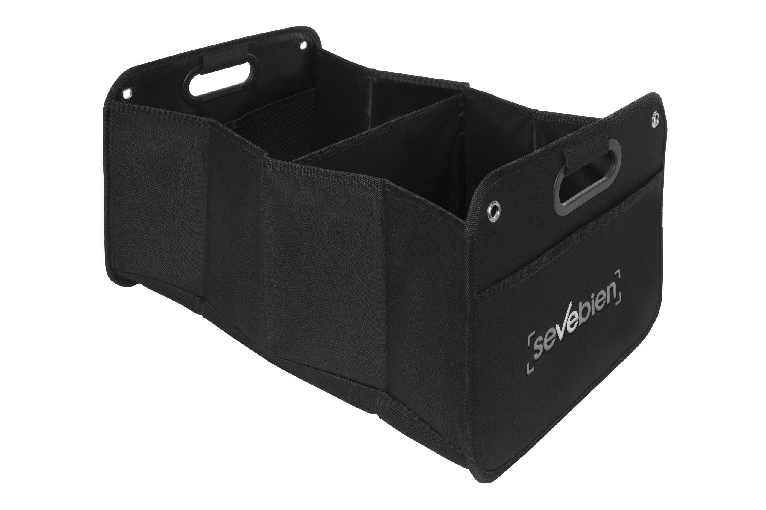 51 x 26,5 x 32,5 cm. (abierto). 5 x 26,5 x 32,5 cm (cerrado). Polyester 600D. Organizador. Dos amplios compartimentos de 25,5 cm (aprox) cada uno con dos estructuras de cartón que permite armar los contenedores. En uno de los compartimentos contiene un bolsillo de red. Manillas/asas recubiertas en plástico. Arandelas metálicas. En la parte inferior contiene velcro que se adhiere a la superficies. Banda elástica que mantiene cerrado el organizador cuando no esta en uso.