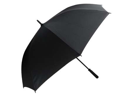 Paraguas ejecutivo gigante, con 8 cascos de tela 190T PONGEE, reverso UV. Contiene varas reforzadas Anti-Vuelco de Fibra de Vidrio color negro y sistema de apertura automático. Mango recto de EVA negro. Incluye funda al tono de 190T PONGEE.