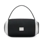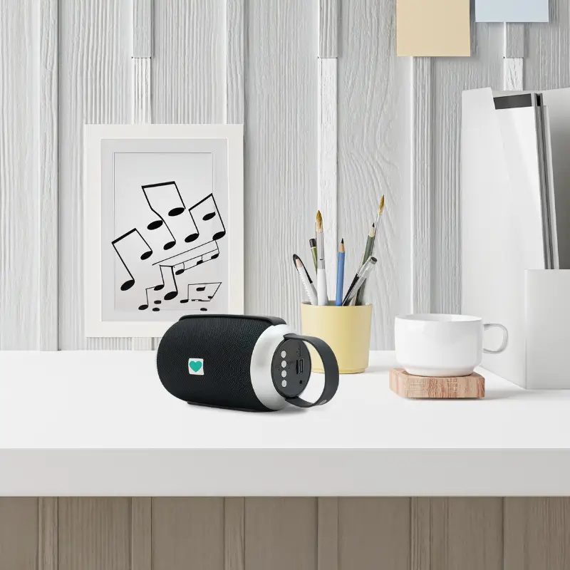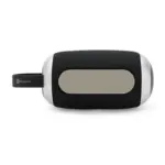 Parlante portátil Bluetooth de color negro con detalles en gris. Cuenta con una correa de agarre y una base que proporciona un mejor apoyo y estabilidad al usarlo en diversas superficies.