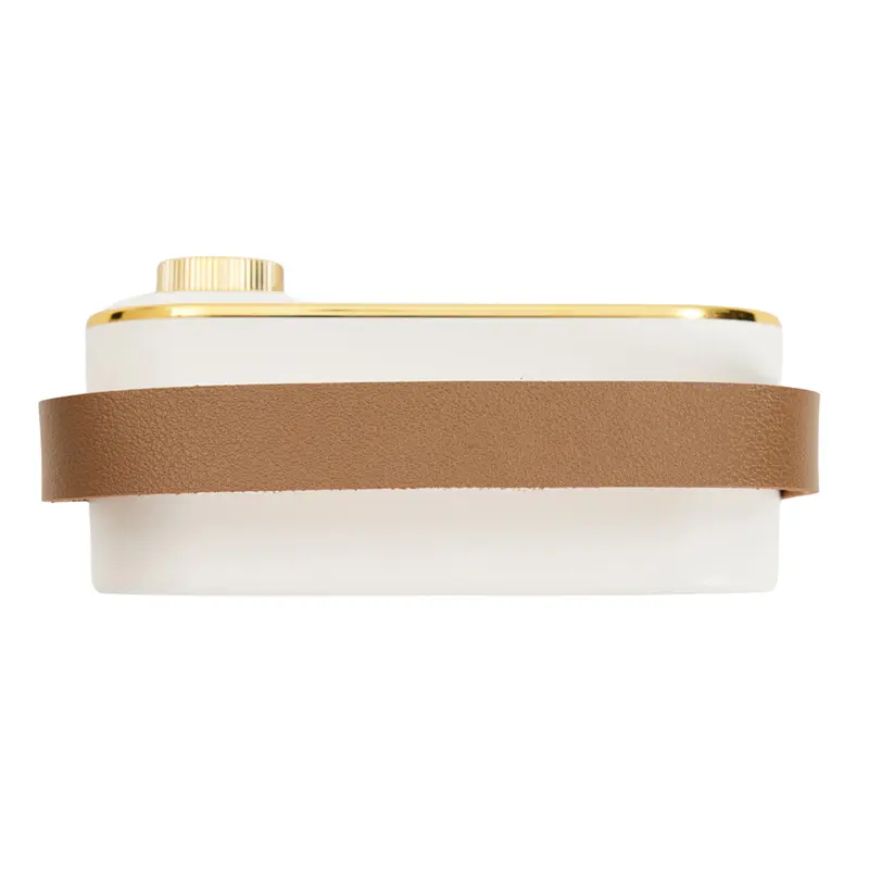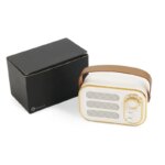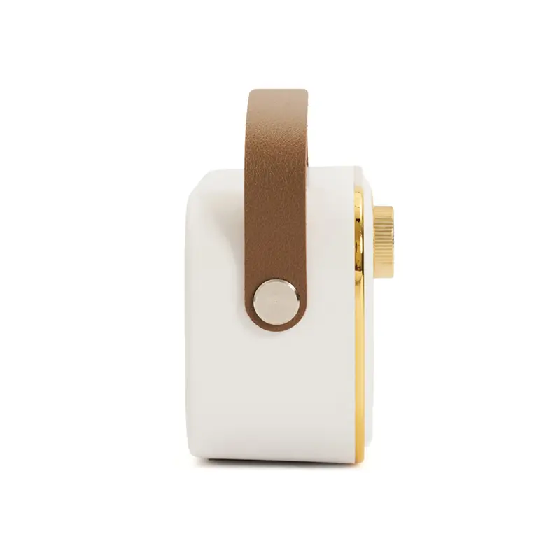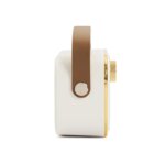 Parlante vintage blanco con correa. Hecho de plástico ABS y cuero PU. Cuenta con correa superior, perilla frontal, botones de control, conexión USB-C, radio FM (87.5–108 MHz), y compatibilidad con Bluetooth, tarjeta TF, USB y entrada AUX. Es ideal para ambientar espacios con estilo retro mientras disfrutás de tu música favorita.