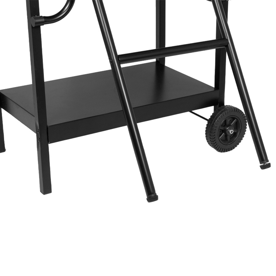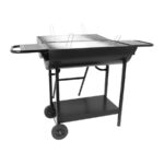 Parrilla doble a Carbón de Acero negro, modelo “Andes”. Altura para cocinar: 80cm. Rejillas cromadas para cocinar: 2 unidades x 69.5 x 37cm x 4mm. Tapa: 74.5 x 40 x 20cm. Bowl para fuego: 74.5 x 40 x 20cm. Bandejas laterales: 2 unidades x 34 x 27.8cm. Incluye Manual instructivo de armado en español.