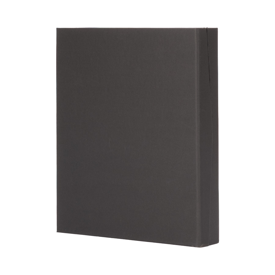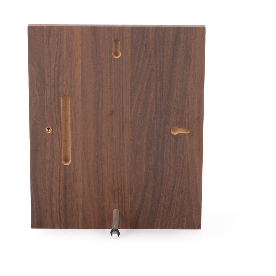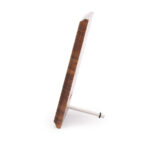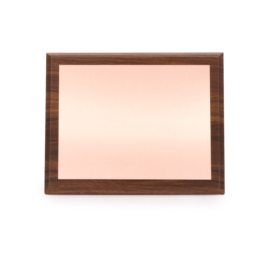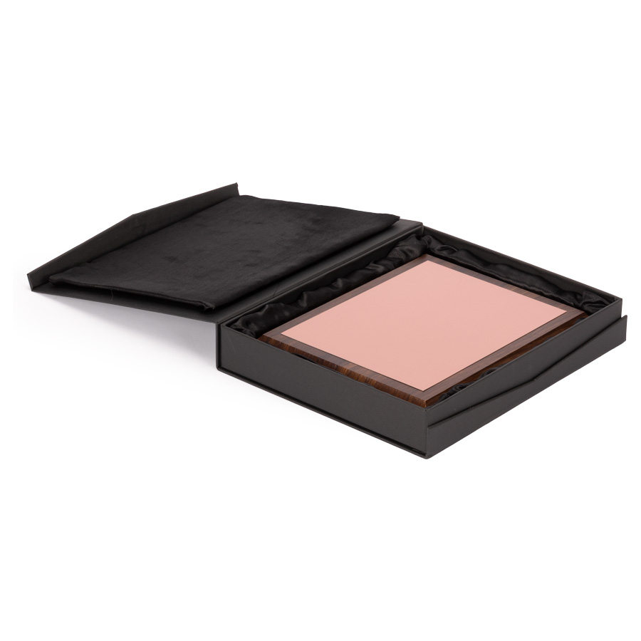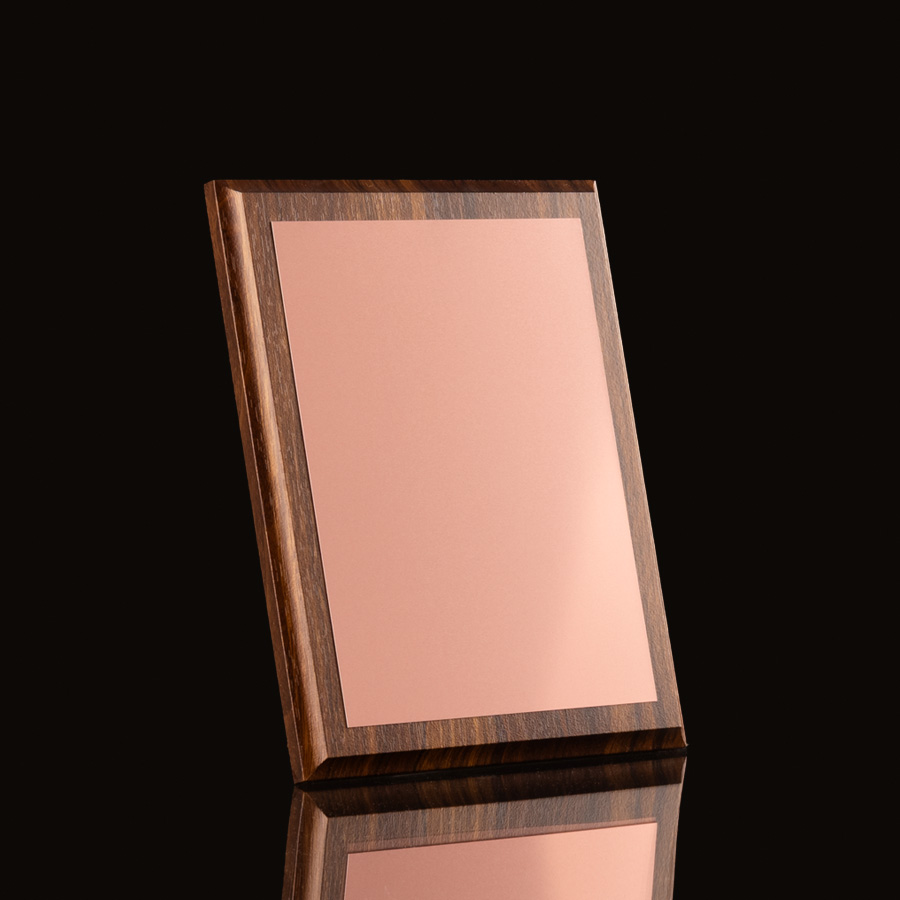 Placa metálica color cobre, modelo “STUDIO”, montada sobre base rectangular de madera barnizada con cantos troquelados. En su parte posterior, incluye orificios y soporte metálico para exhibición vertical u horizontal. Presentación en caja de cartón forrado negro con cierre imantado, interior acolchado de espuma y tela poliéster satinado negro, con troquel. OJO: la placa metálica viene con film plástico removible, para protección de la misma.