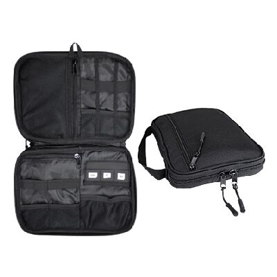 Bolso Porta-Accesorios de Viaje, en tela Polyester 840D. Gran cantidad de bolsillos y compartimentos para accesorios, bolígrafos, tarjetas de memoria, etc. Con gancho de tela para colgar. Un bolso práctico y pequeño, ideal para llevar dentro de tu equipaje de mano.