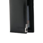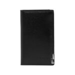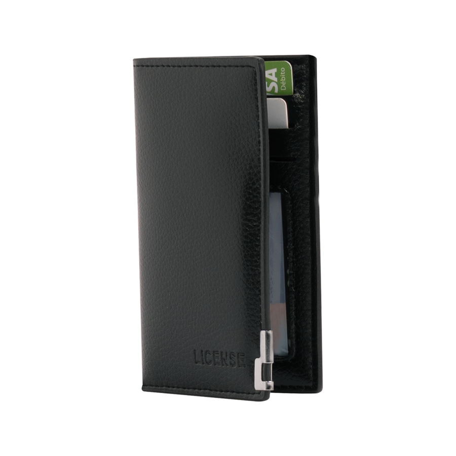 Billetera portas-tarjetas de eco-cuero negro, formato vertical, modelo “LICENSE”. Contiene 8 compartimentos interiores. Presentación en bolsa frozen y caja de cartón forrado negro opaco.