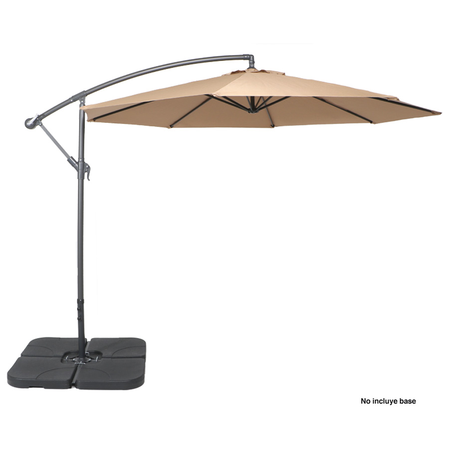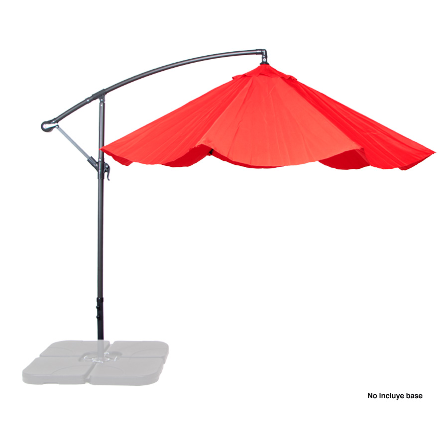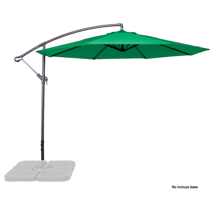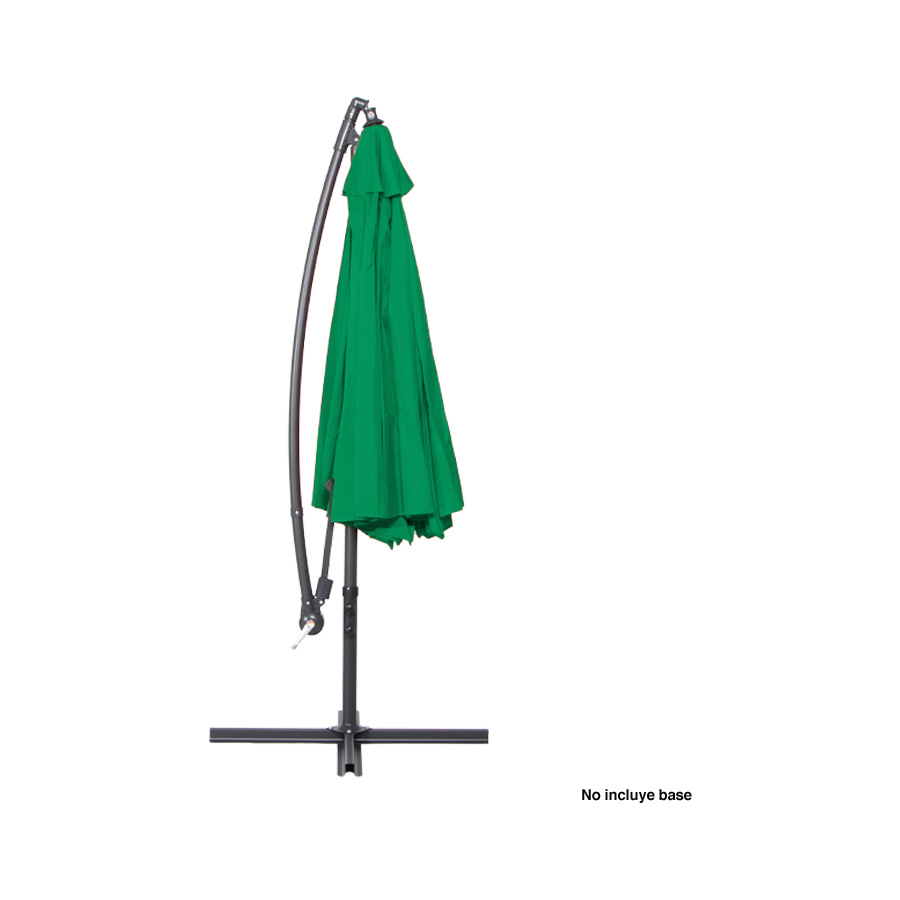 Quitasol colgante redondo de Ø3m, modelo “Banana”, con 8 cascos de lona Poliéster UV impermeable de 160g. Contiene varas reforzadas de Acero recubierto de 12 x 18mm, asta de Acero recubierto de 48mm, sistema de apertura manual.