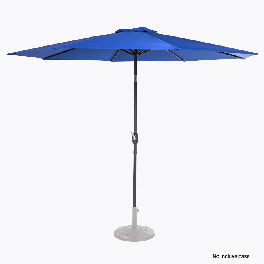 Quitasol redondo de Ø3m, modelo “Shake”, con 8 cascos de lona Poliéster UV impermeable de 160g. Contiene varas reforzadas de Acero recubierto de 12 x 18mm, asta de Acero recubierto de 38mm, sistema de apertura automático con manivela y codo giratorio de 45°. No incluye base.