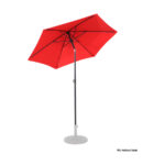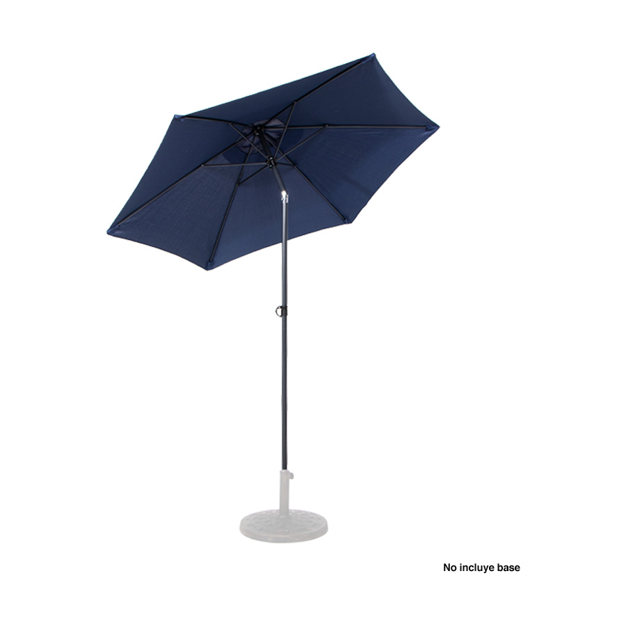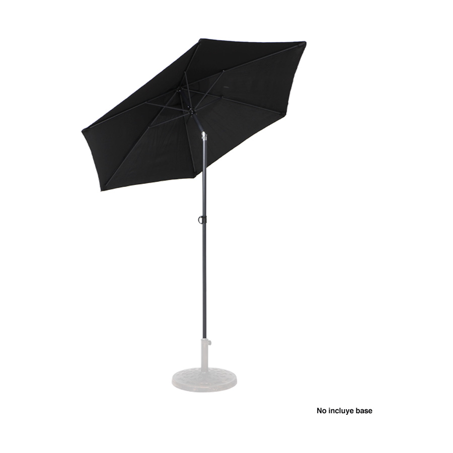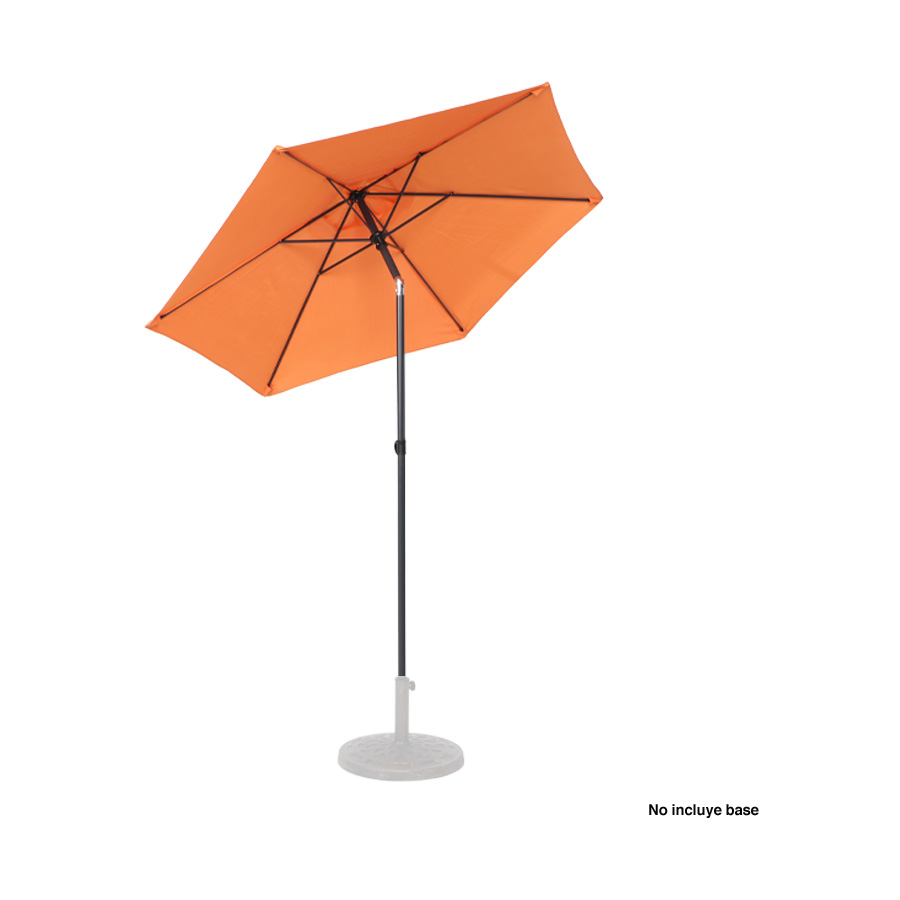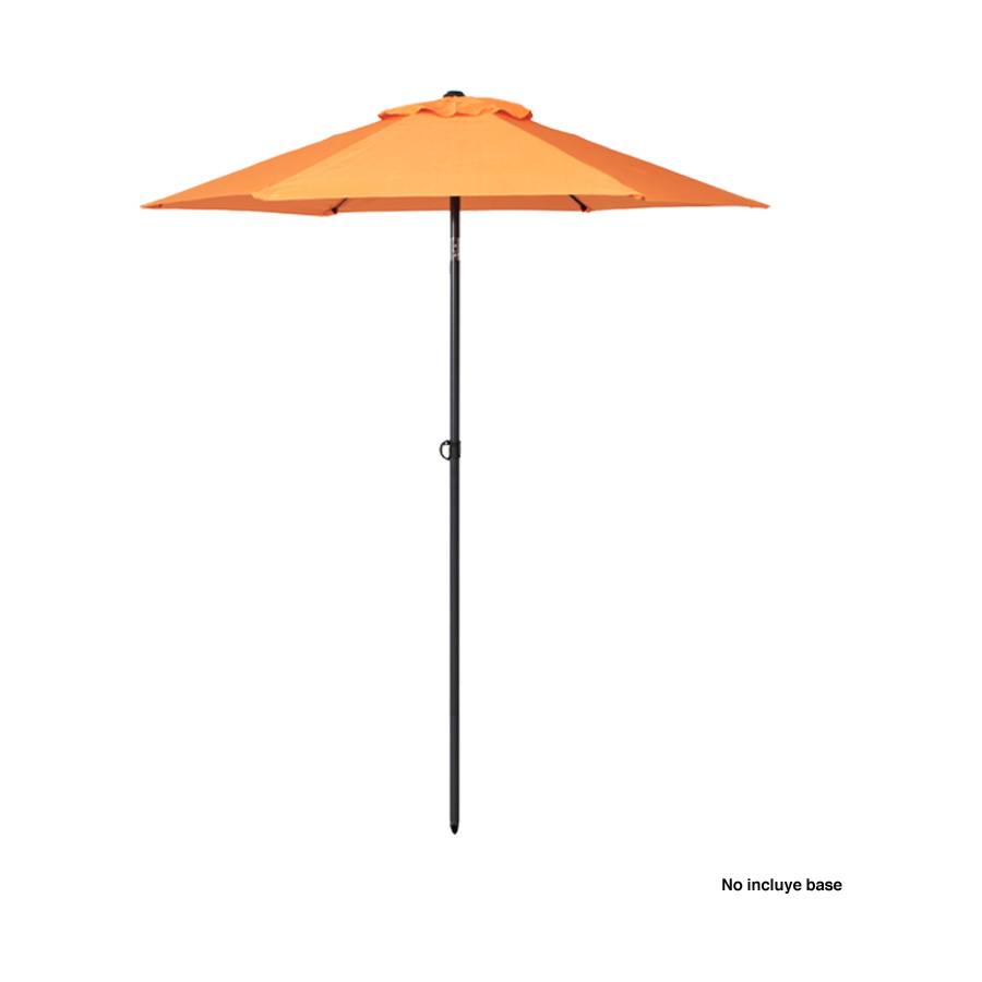 Quitasol redondo de Ø2m, modelo “Twist”, con 6 cascos de lona Poliéster UV impermeable de 160g. Contiene varas reforzadas de Acero recubierto de 12 x 18mm, asta de Acero recubierto de 32mm, sistema de apertura manual y codo giratorio de 45°. No incluye base.