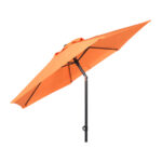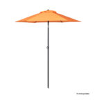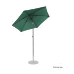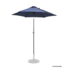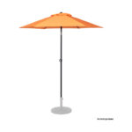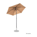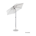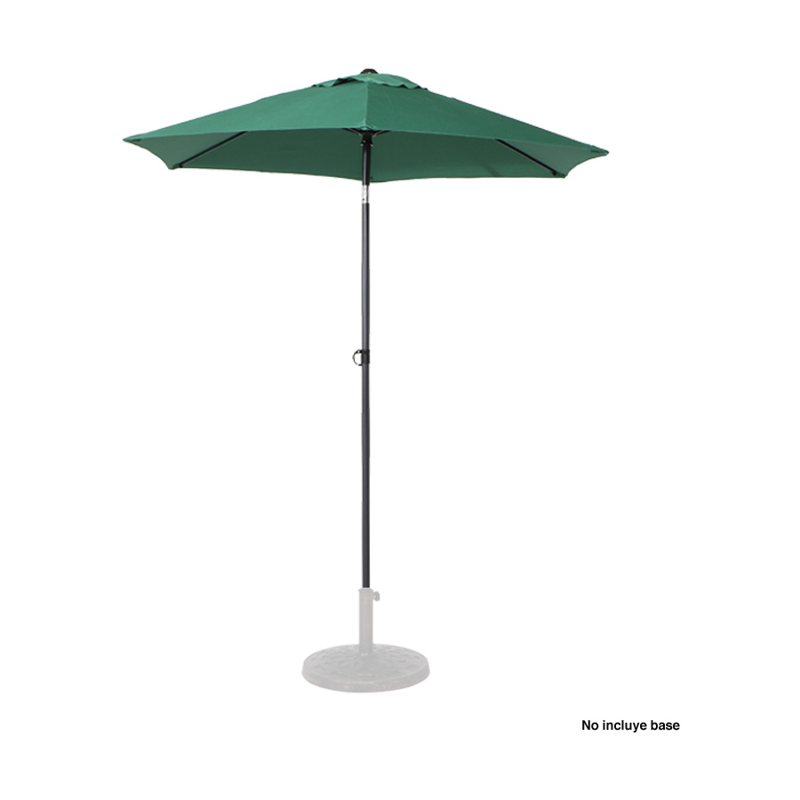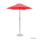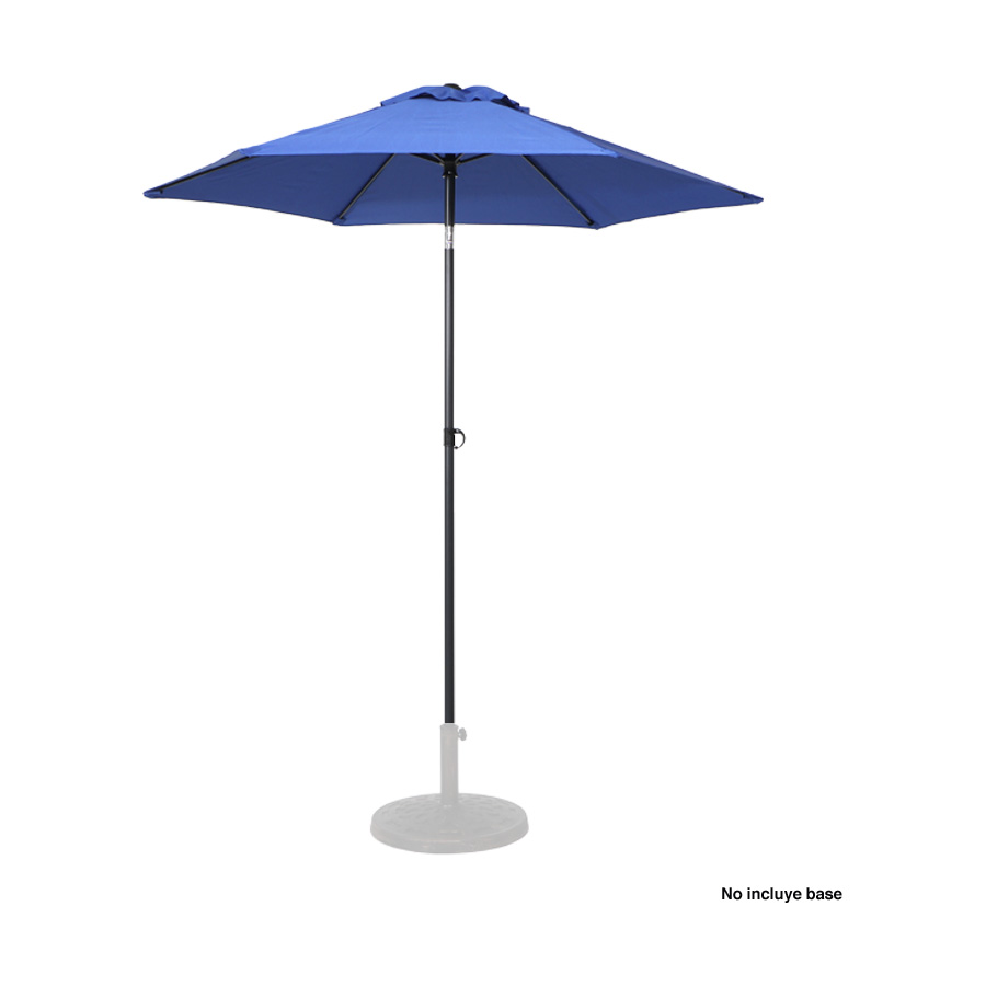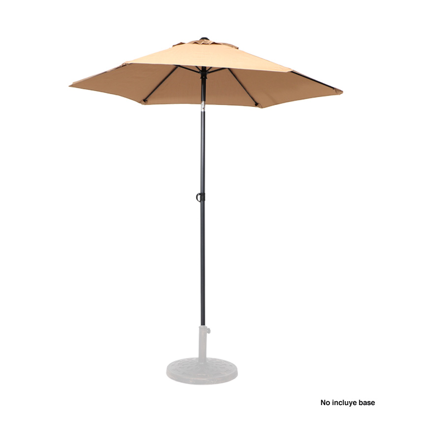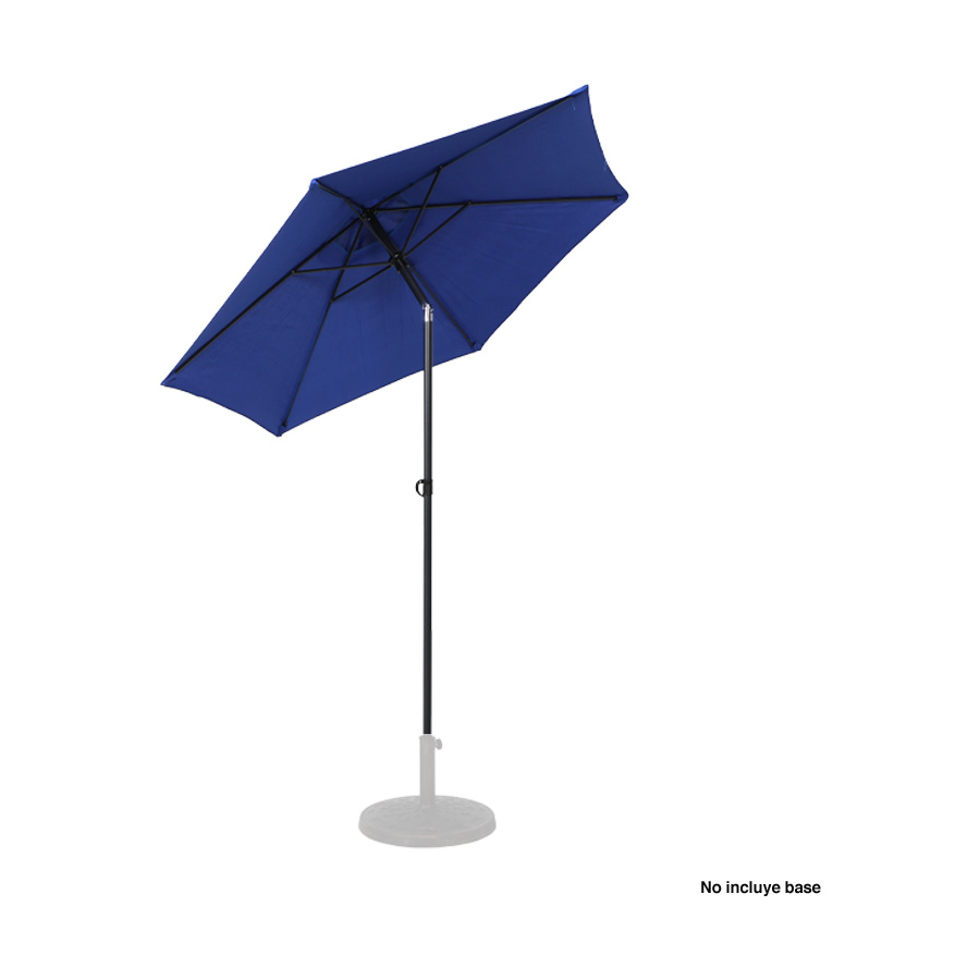 Quitasol redondo de Ø2m, modelo “Twist”, con 6 cascos de lona Poliéster UV impermeable de 160g. Contiene varas reforzadas de Acero recubierto de 12 x 18mm, asta de Acero recubierto de 32mm, sistema de apertura manual y codo giratorio de 45°. No incluye base.