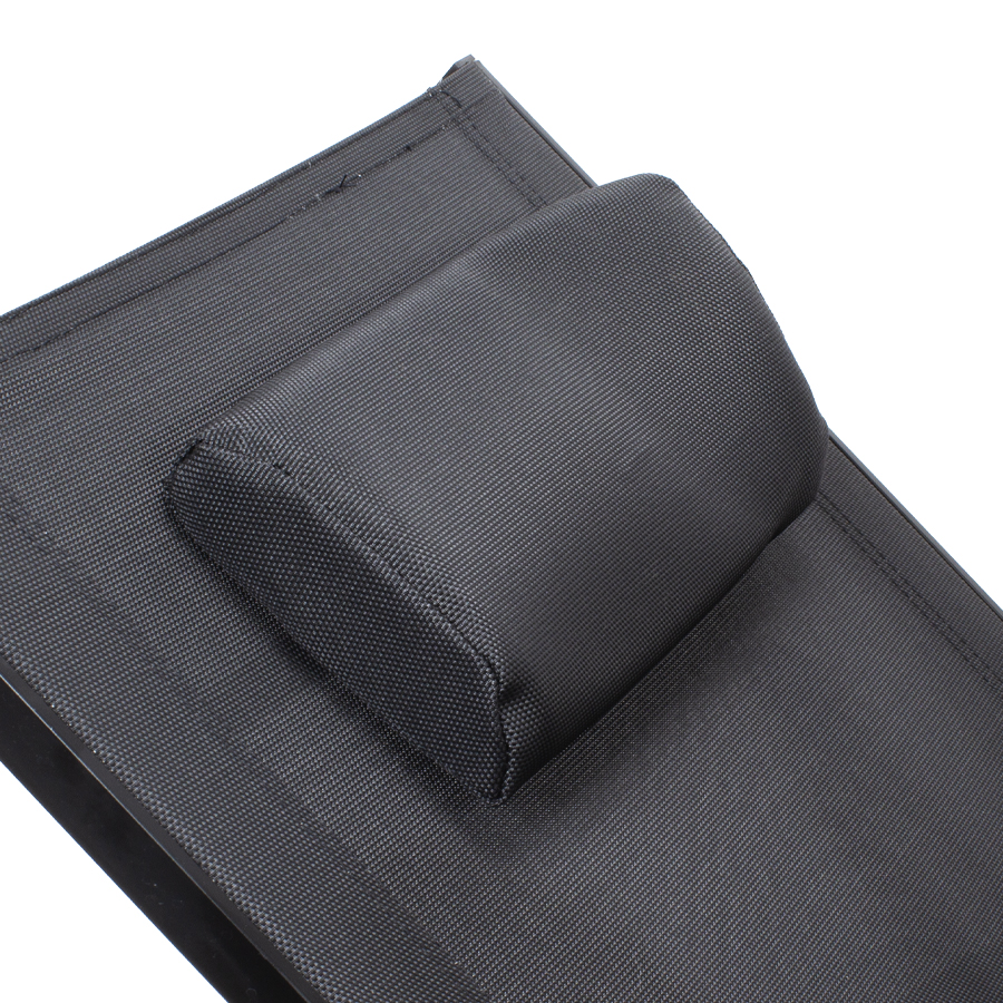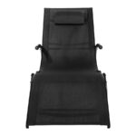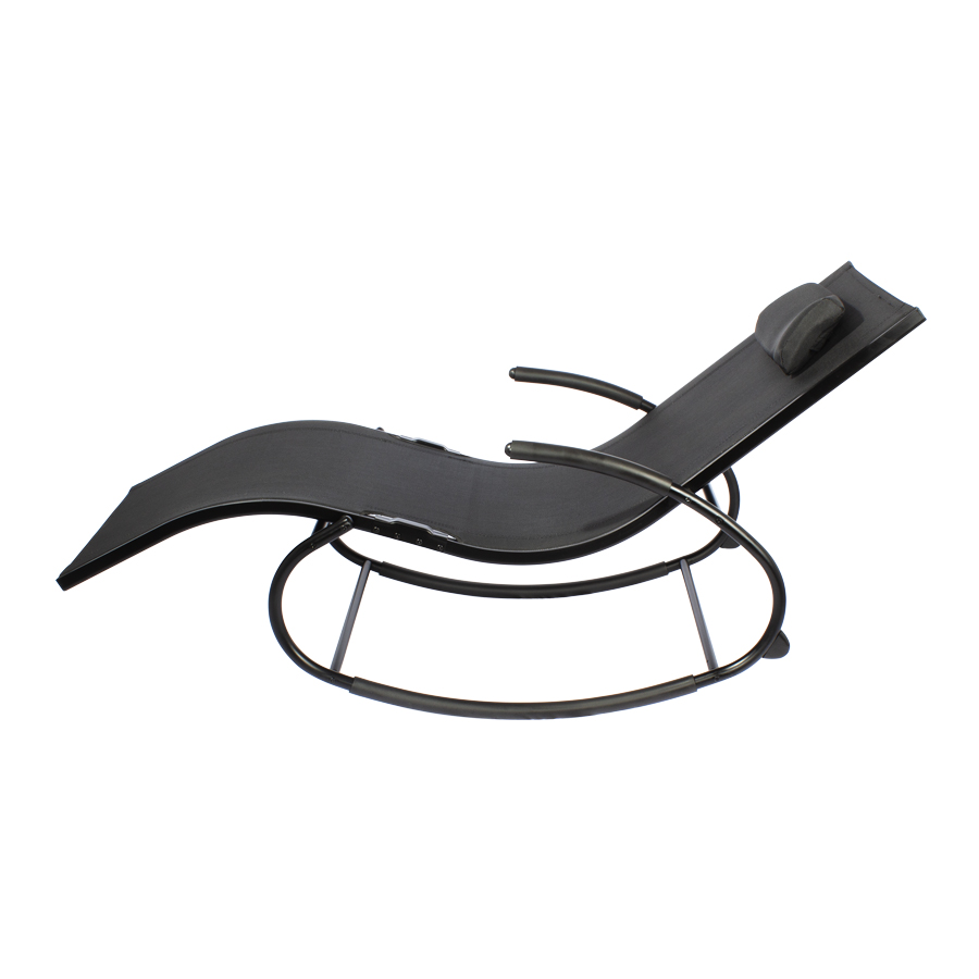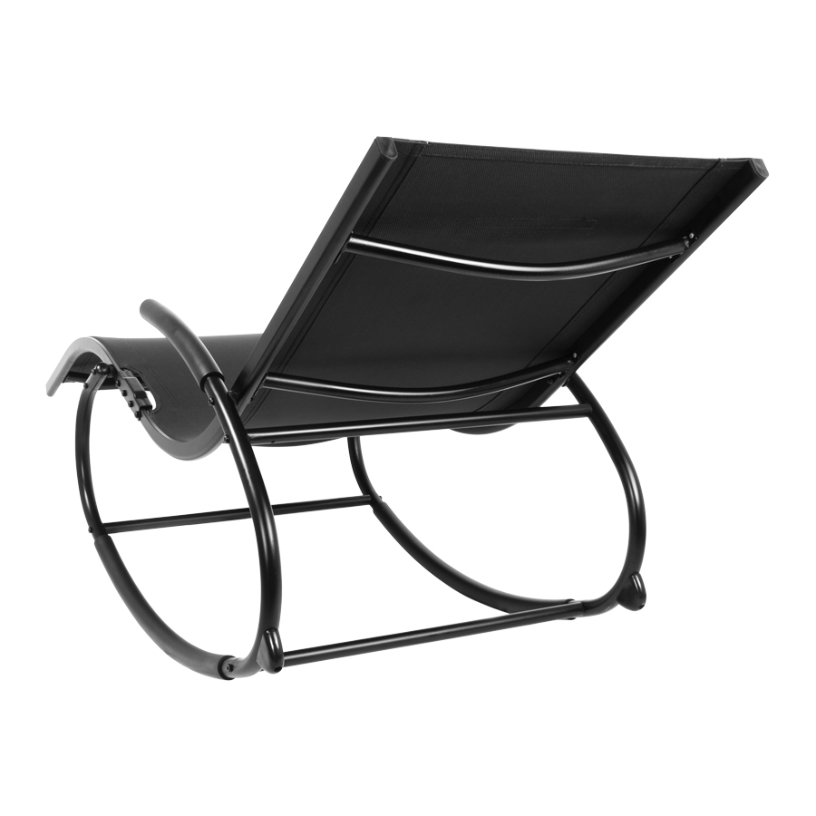Reposera mecedora negra con apoya-brazos, modelo “Ventus”. Estructura de Aluminio color negro, asiento de Textilene negro. Descanso y relajo verdaderos.