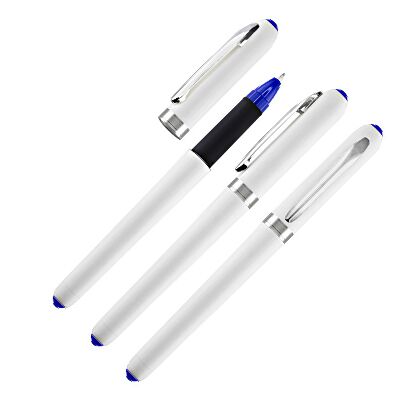 Roller Pen plástico blanco modelo “Titan”, con terminales plateados. Diseño simple y moderno. Escritura azul.