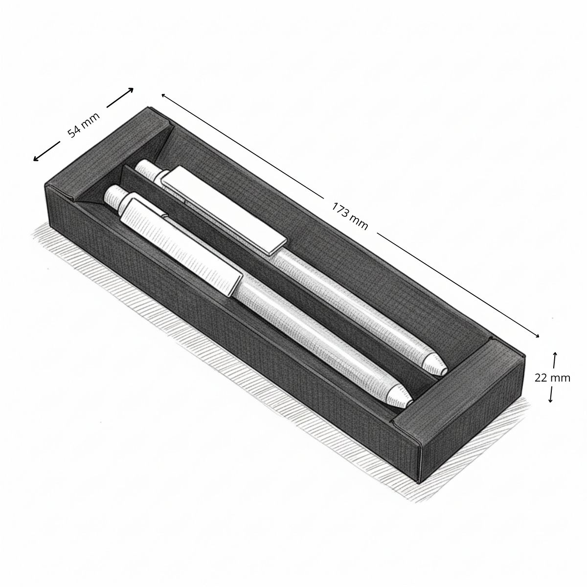 ANAPOIMA reúne lo esencial del diseño ejecutivo con una mirada comprometida con el planeta. Este set incluye bolígrafo y portaminas fabricados en aluminio reciclado, con cuerpo plateado y detalles en fibra de trigo que aportan un contraste natural. Empacado en una caja negra elegante, ANAPOIMA es una excelente alternativa para transmitir sofisticación sin exceso, y ligereza sin descuido ambiental. Tu marca cobrará fuerza al asociarse con herramientas que reflejan precisión, estilo y responsabilidad en cada detalle.