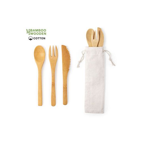 Set de 3 cubiertos de línea nature. Fabricados en bambú, incluye tenedor, cuchara y cuchillo. Presentados en funda de algodón con cordón auto cierre. 3 Piezas