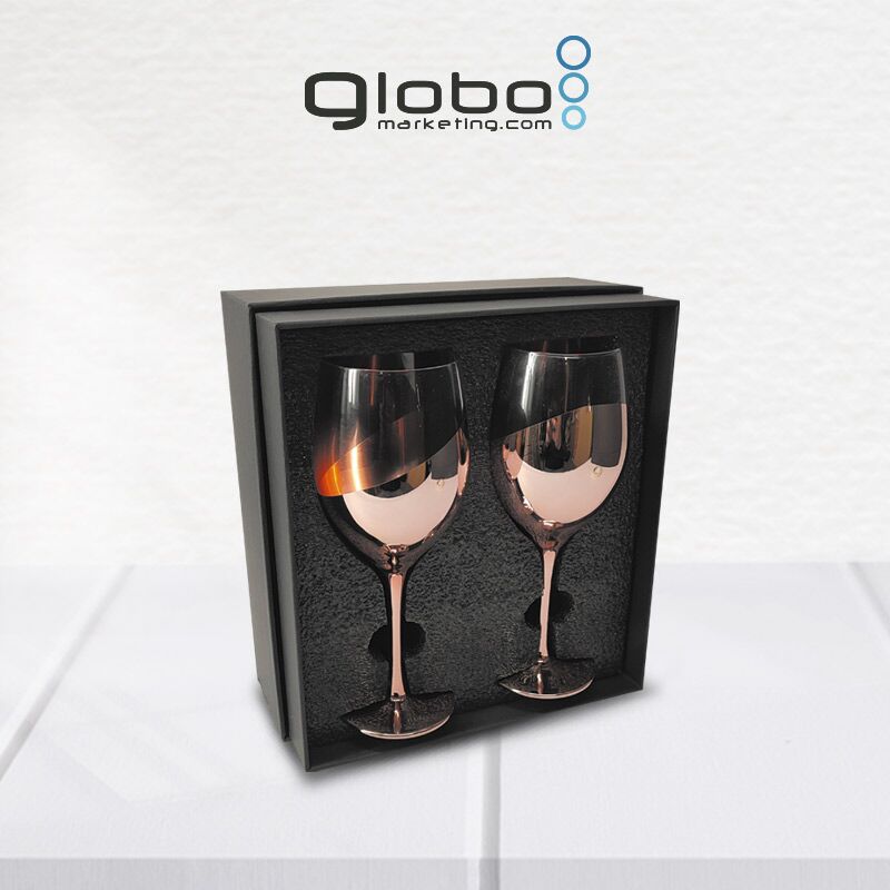Set 2 copas de vino de 415 ml encobrizadas. Presentación en caja negra de lujo con interior de cuna EVA negro.
