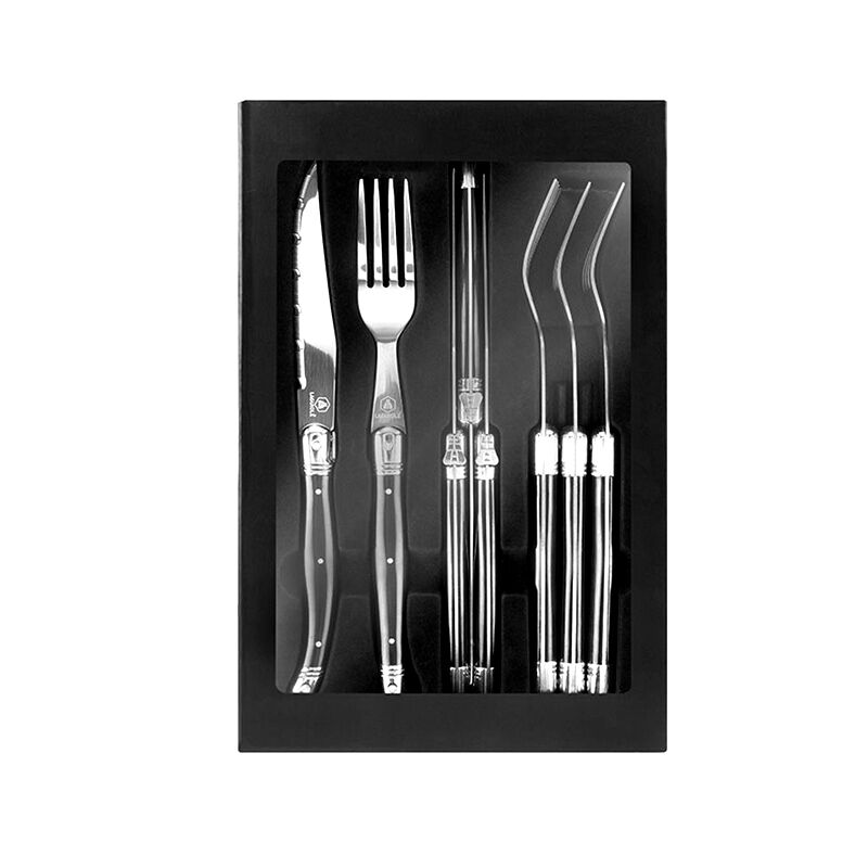 Hojas de acero forjado 420 y mango ABS con detalles metálicos. Medidas de la caja: 28cm x 18cm x 3cm. Producto libre de BPA. Laguiole