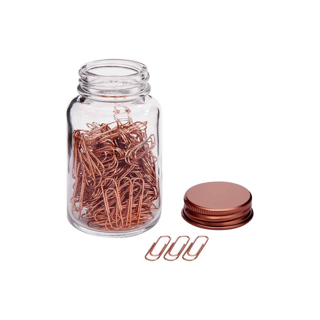 Ø 4,5 x 8,5 cm. Vidrio y metal. Set de clips metálicos en frasco de vidrio con tapa metálica.