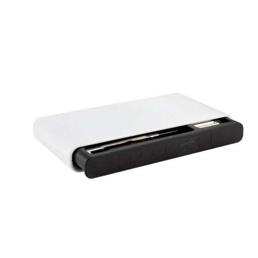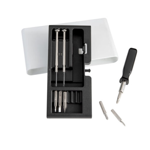 Set de destornilladores. Incluye: 1 mango con punta imantada, 6 puntas diferentes (3 planas: 1,5 ; 3 y 4 mm. y 3 cruz: 0000, 0 y 1mm.) y 2 destornilladores de precisión (1 plano y 1 cruz). Base imantada que permite mantener ordenadas las diferentes puntas. Apertura push.