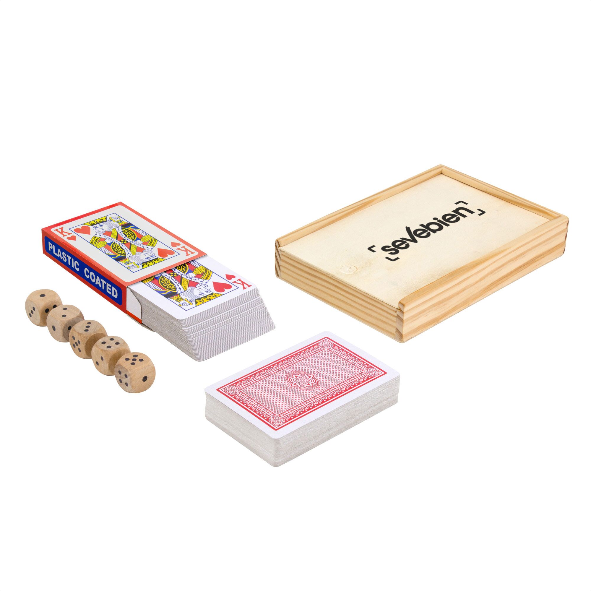 15 x 10,3 x 2,7 cm. Madera y papel plastificado. Set de entretenimiento. Incluye: 2 juegos de cartas de poker plastificadas y 5 dados de madera de cerezo. Caja contenedora de madera de pino y tapa deslizable en polywood. Presentación en caja de regalo kraft.