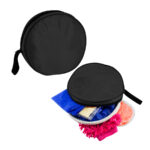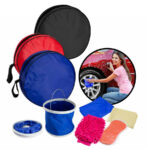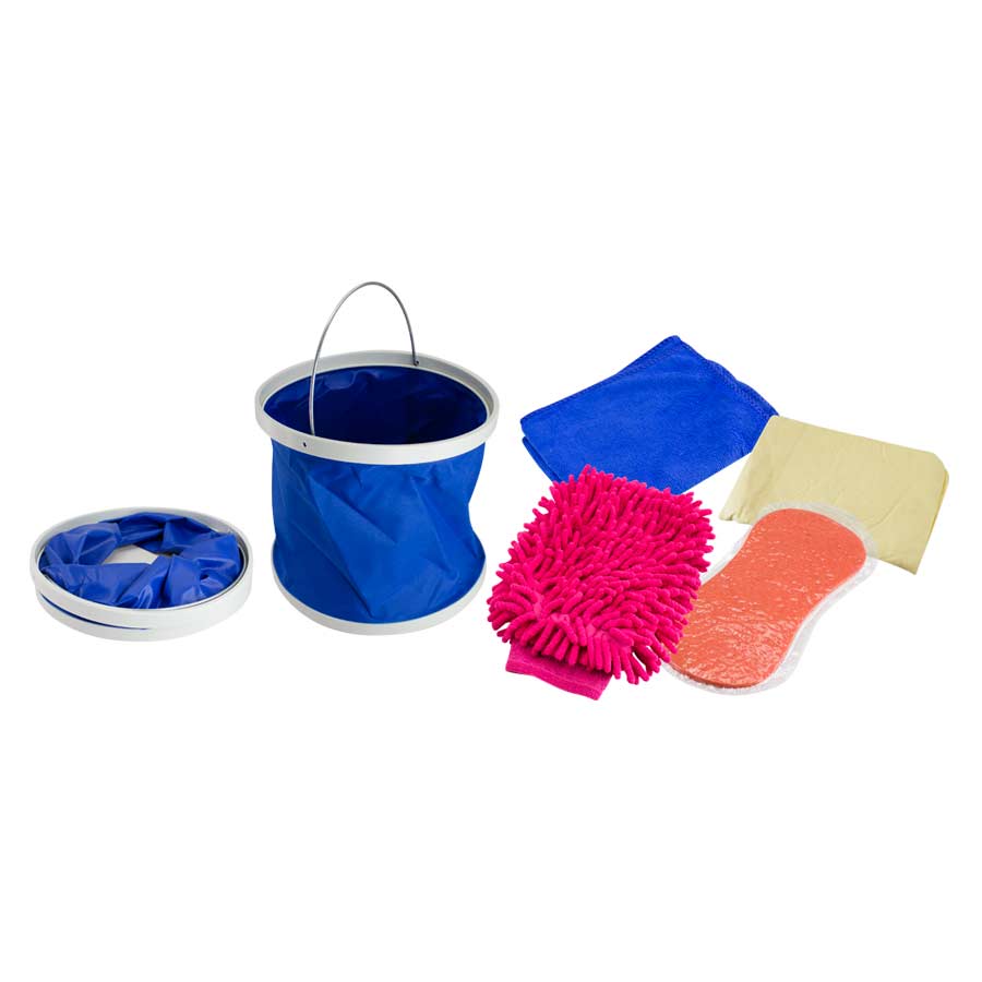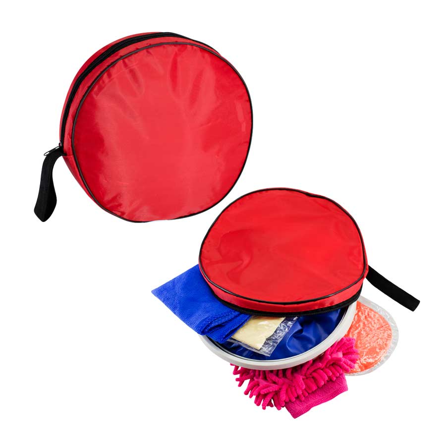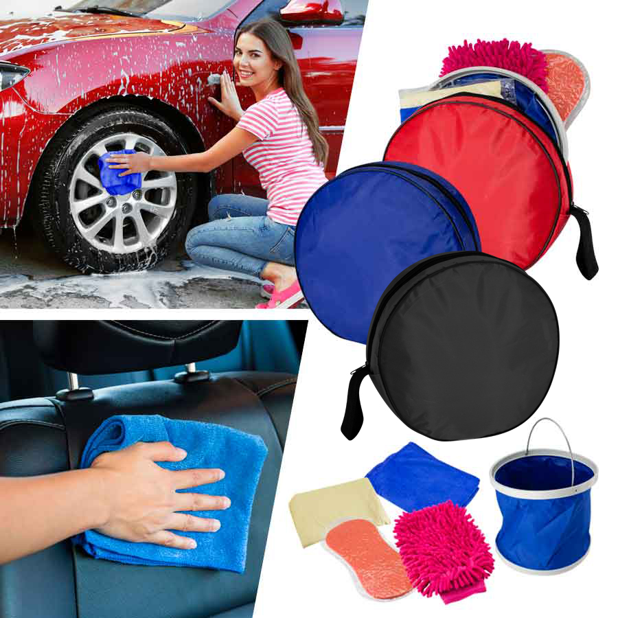 Set de Lavado de Automóvil en Estuche redondo de tela poliéster. Contiene 5 accesorios: balde plegable azul de D23.6 x 22.4 cm, toalla de microfibra azul de 67 x 28 cm, paño limpia-vidrios amarillo de 42 x 31 cm, esponja expandible naranja de 22 x 11 x 4 cm, guante de lavado fucsia de 19 x 21 cm.