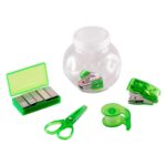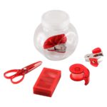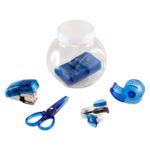 Set de oficina en frasco plástico transparente con tapa frozen. Ideal espacio para logo en tapa.