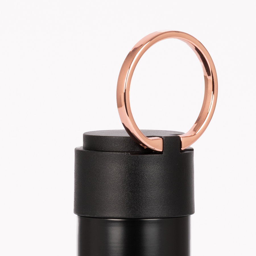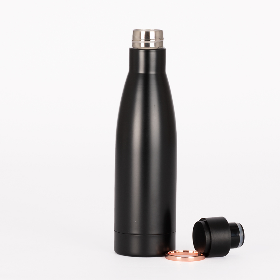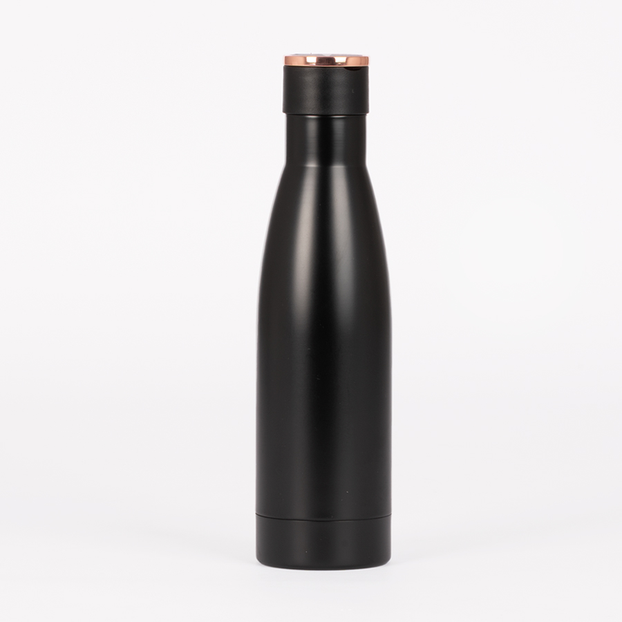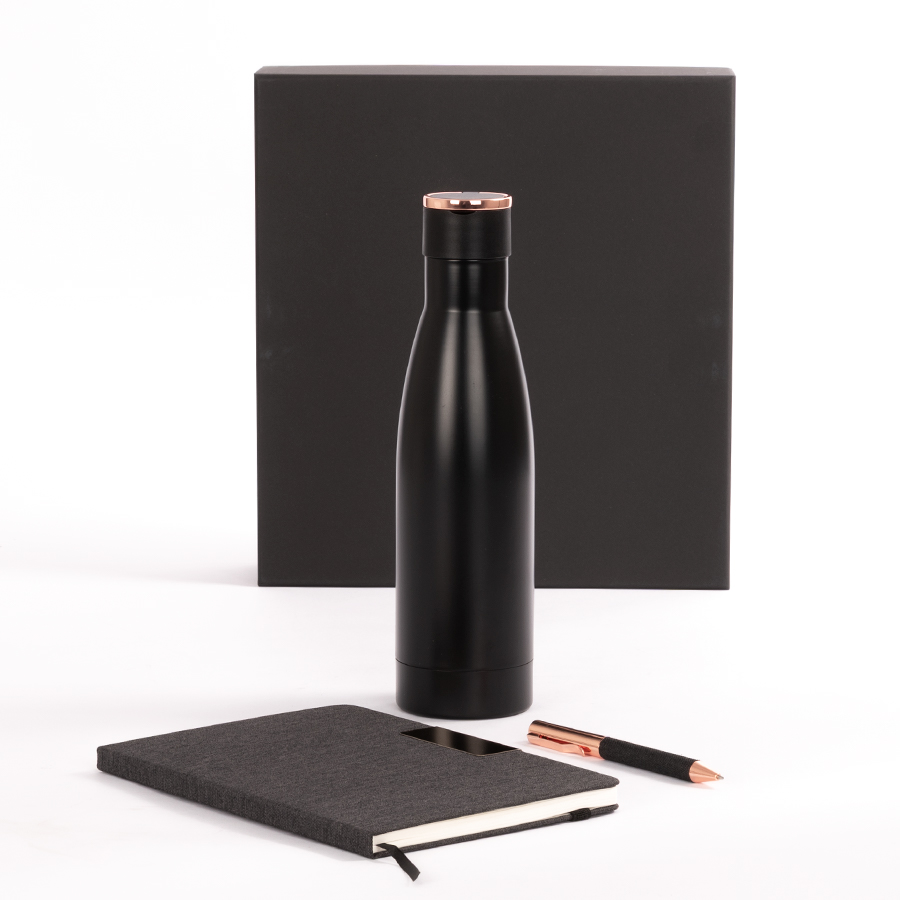 Set de Regalo incluye Termo 550 cc. producto BPA FREE, para el contacto con líquidos y alimentos, con tapa twist-off y asa redonda encobrizada + Cuaderno tapa dura recubierta en tela Oxford negro, con cierre elasticado y detalle metálico encobrizado, interior 80 hojas punteadas (dotted) color ivory (hueso) + Bolígrafo metálico encobrizado con tela Oxford negra, escritura negra . Presentación en elegante caja de carton color negro con tapa, interior cuna de EVA aterciopelada negra. Sobre funda de papel negro.