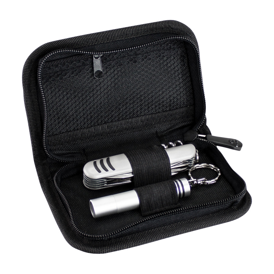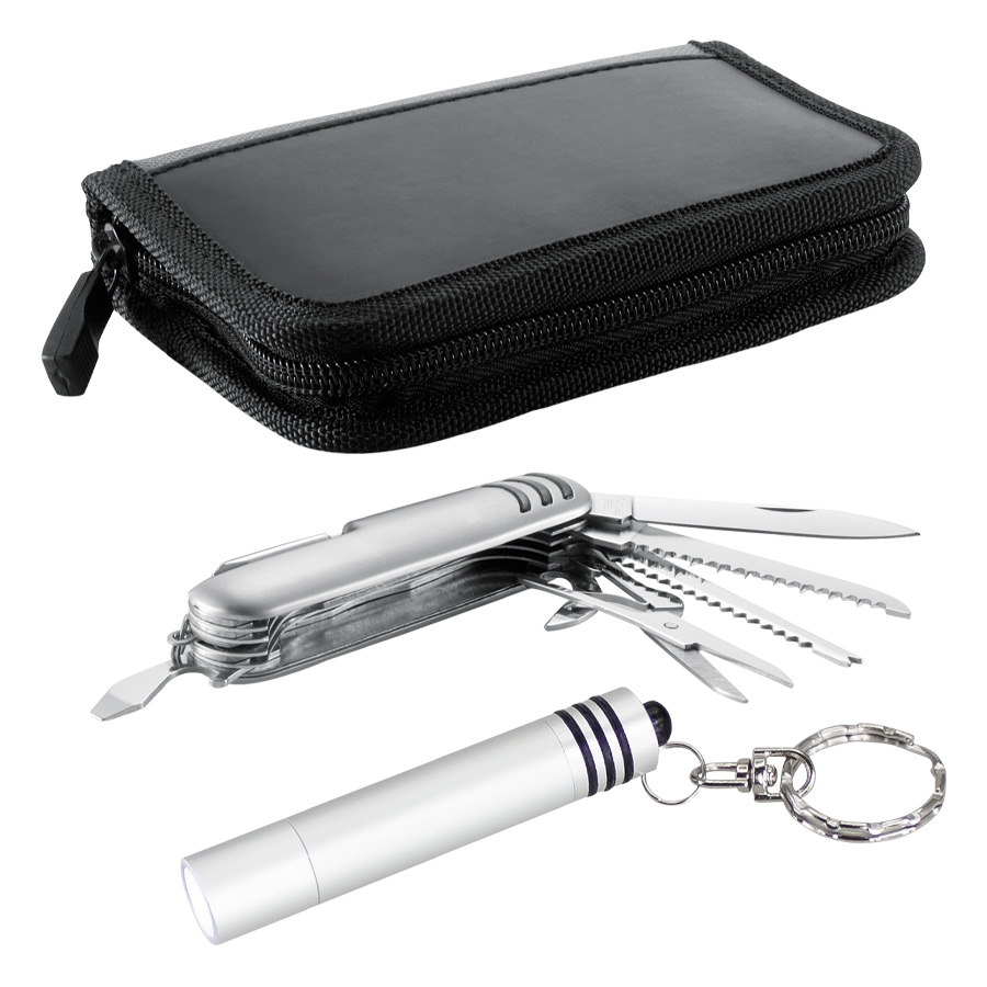 Set de Supervivencia “XD”, incluye Cortapluma 12 funciones + Llavero-Linterna LED metálica de 9 cm + 3 pilas botón tipo AG3, presentación en elegante Estuche Negro con Gris.