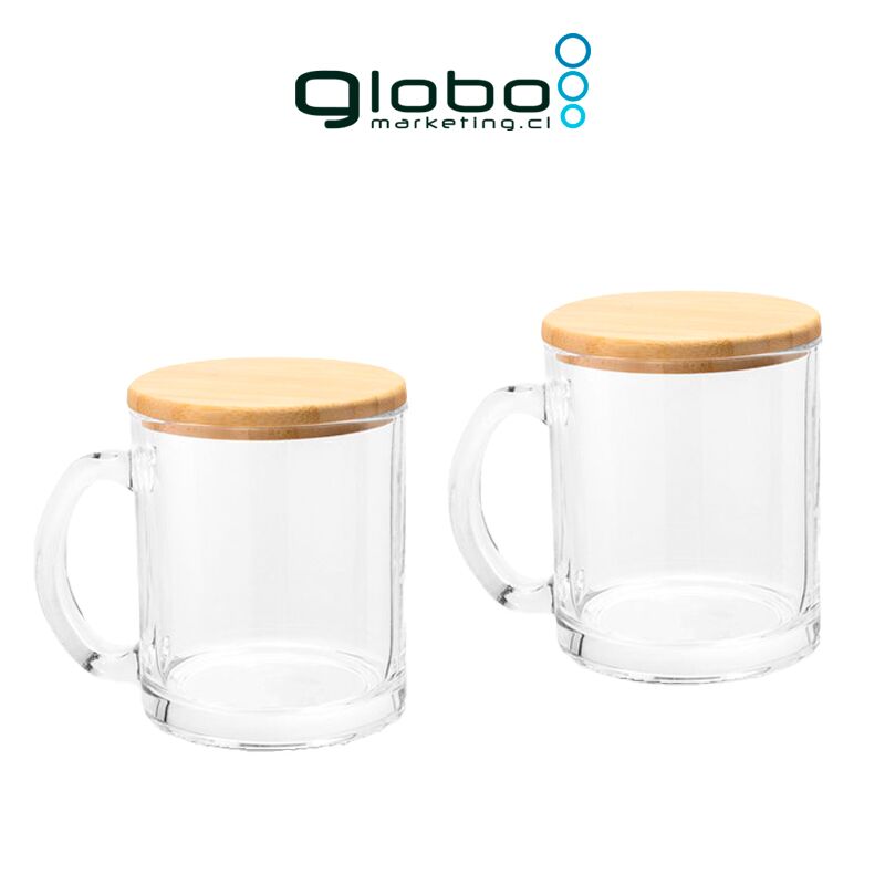 Set de dos tazas de vidrio con tapa de Bambú barnizado.