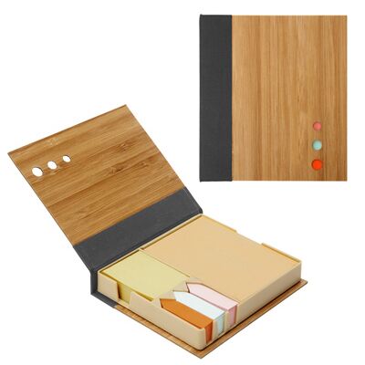 12 x 10,5 x 2 cm. Bambú. Contiene un block adhesivo rectangular de papel reciclado, un block adhesivo pequeño de color y 3 blocks en forma de flecha. El exterior del estuche es de bambú con detalles de tela, el interior es de plástico con divisiones.
