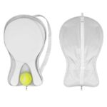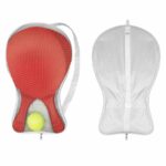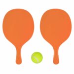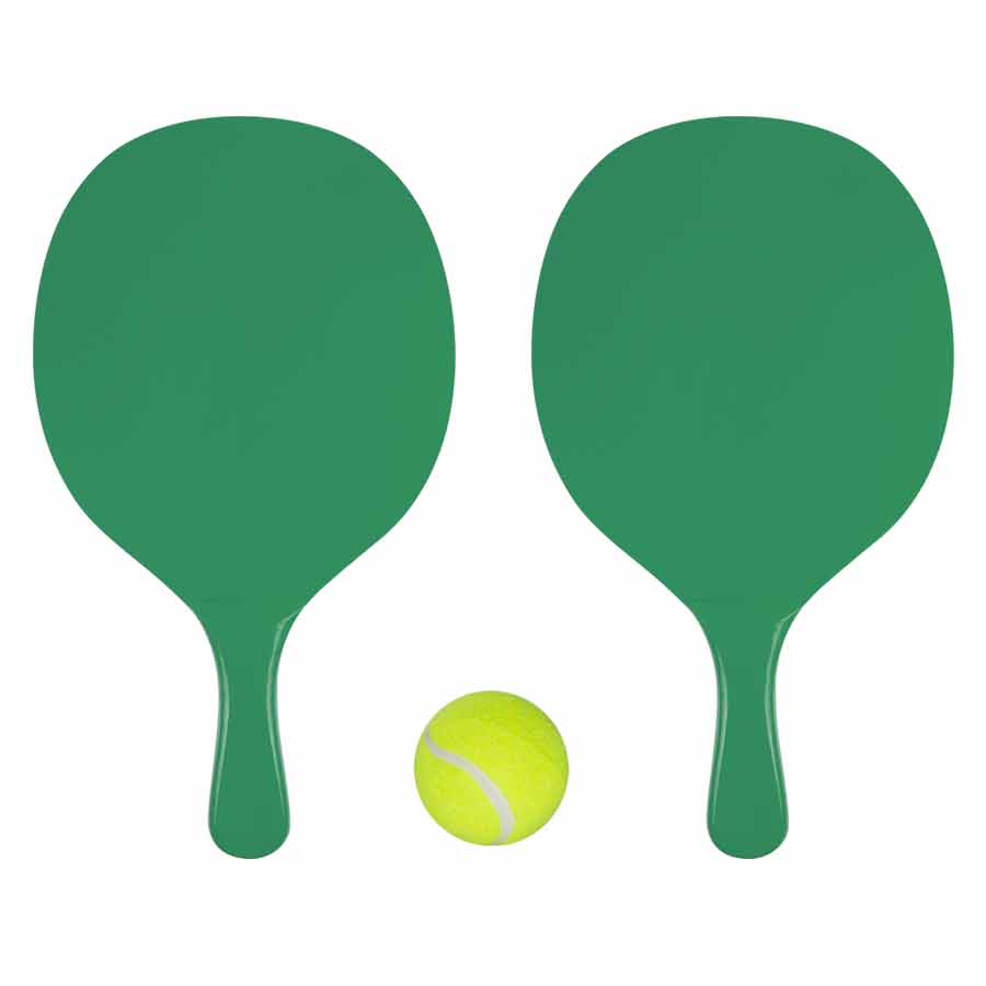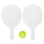 Set de Paletas de Playa de MDF esmaltado de 12mm. de espesor, modelo “Premium”. Incluye bolso de tela poliéster blanco con frente malla y cinta para colgar + pelota de tenis amarilla. Cada paleta viene dentro de bolsa de polietileno.