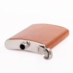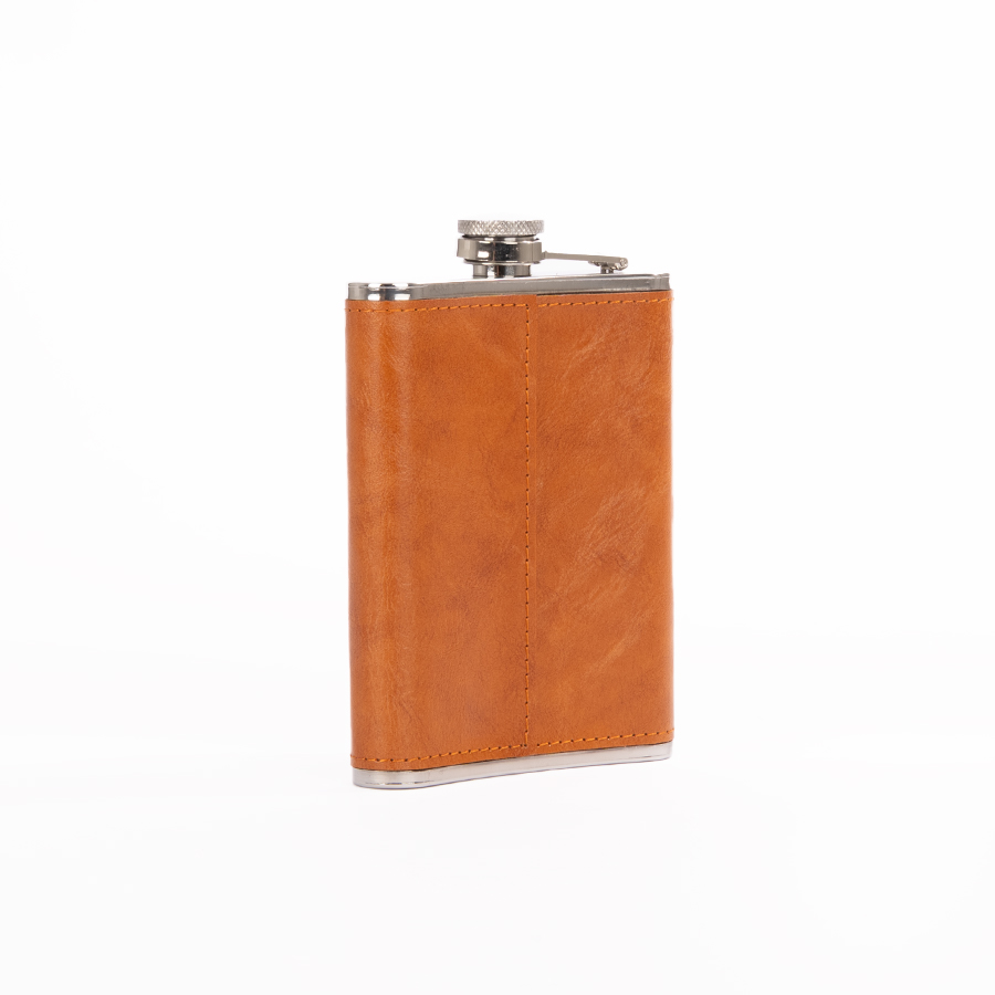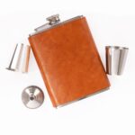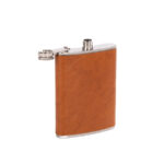 Set Petaca Licorera con cubierta de eco-cuero café claro (color caramelo) + 2 vasitos + 1 embudo de Acero Inoxidable SS304, modelo “OXFORD”. Capacidad Petaca 8 oz (237 ml). Presentación en elegante estuche de cartón forrado negro con tapa. Interior cama aterciopelada negra.