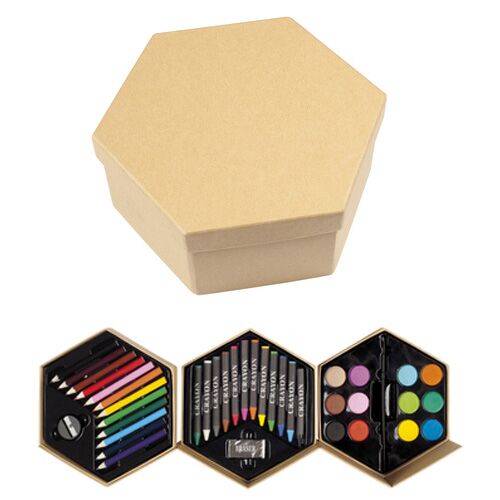 16 x 8 cm. (cerrado) 44 x 8 cm. (abierto). Cartón. Set de pinturas en forma de hexágono. 12 lapices de colores, 1 sacapuntas, 12 carayones, 1 goma de borrar, 12 acuarelas y 1 pincel.