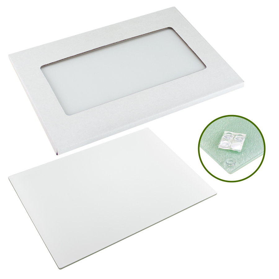 Tabla de Cocina para cortar alimentos, en vidrio texturado para Sublimación. Presentación en caja de cartón blanco.