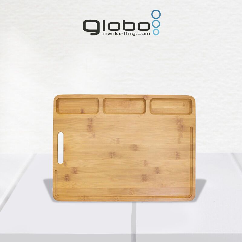 43 x 32 x 1.8 cm. Tabla de corte en Bambú. Tres compartimentos para armar botanas y llevarlas directo a la mesa. Transportable con manija incluida. Presentación en caja de regalo.