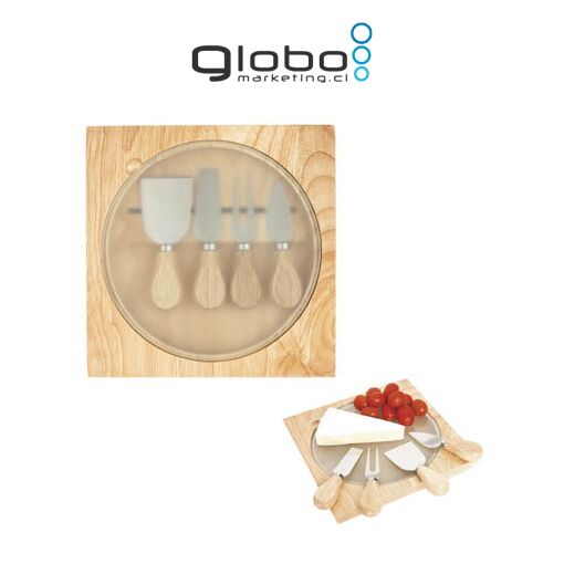 23 x 23 x 2,5 cm. Madera. Tabla de queso en la parte interna contiene imán que sostiene 4 utensilios para quesos de acero inoxidable y mango de madera. Tabla circular de vidrio templado Ø 20 cm.