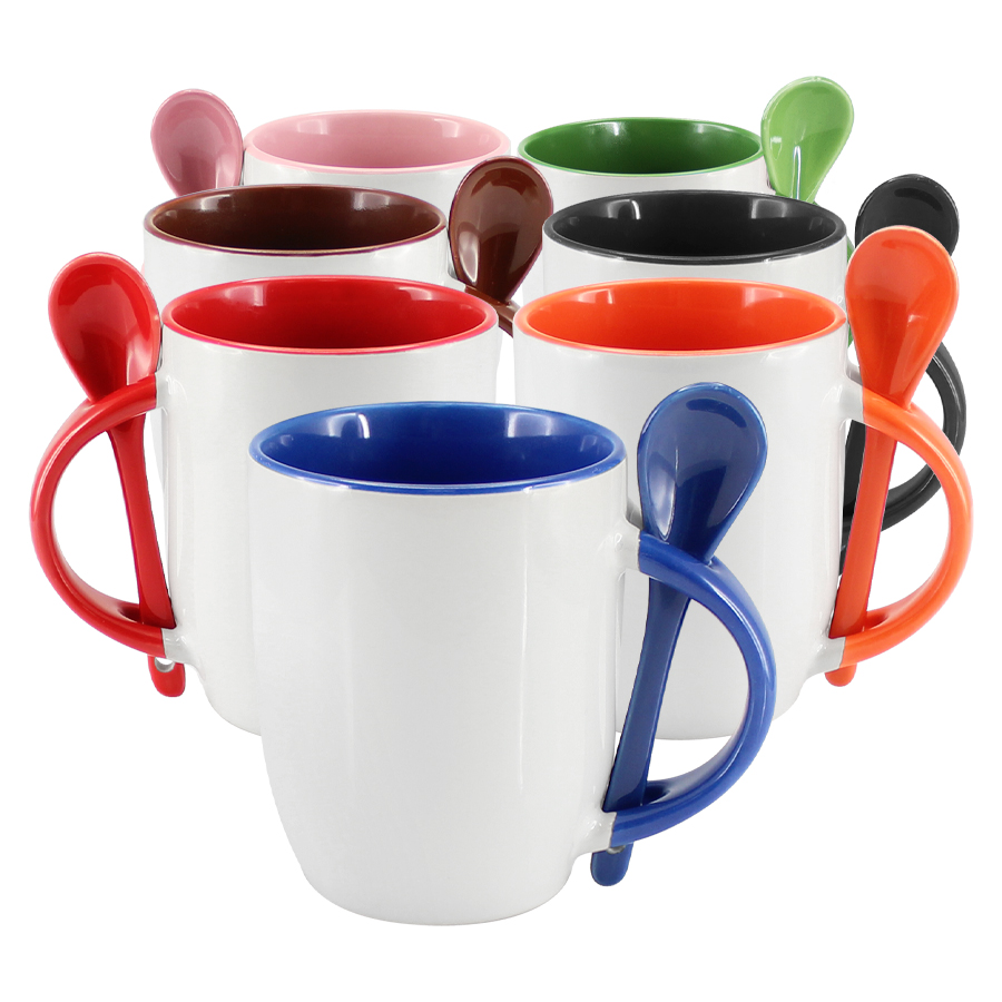 Tazón Cerámico blanco con interior, asa y cuchara de color, cobertura exterior con polímero especial marca ORCA COATINGS(R) para una sublimación de primera calidad. Cada unidad se entrega dentro de su caja individual de cartón blanco.