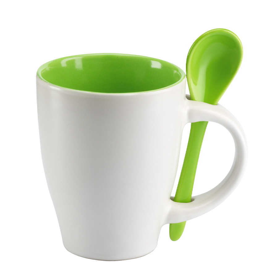 Tazón Cerámico Blanco opaco con interior y cuchara de color. Presentación en caja de cartón blanco.