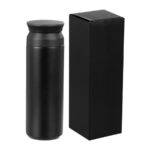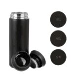 Botella térmica metálica doble pared aislante, cubierta de Polipropileno (PP) acabado mate, interior Acero inoxidable 304 SS, exterior Acero inoxidable 201 SS, modelo “SMART LID”. Incluye doble tapa rosca de plástico PP negro, con sello cilíndrico de silicona, sistema de filtro circular y termómetro digital en la tapa superior, que marca la temperatura del líquido interior. Capacidad 480ml. Producto BPA FREE, para el contacto con líquidos y alimentos. Presentación en bolsa plástica transparente + caja de regalo de cartón laminado negro.