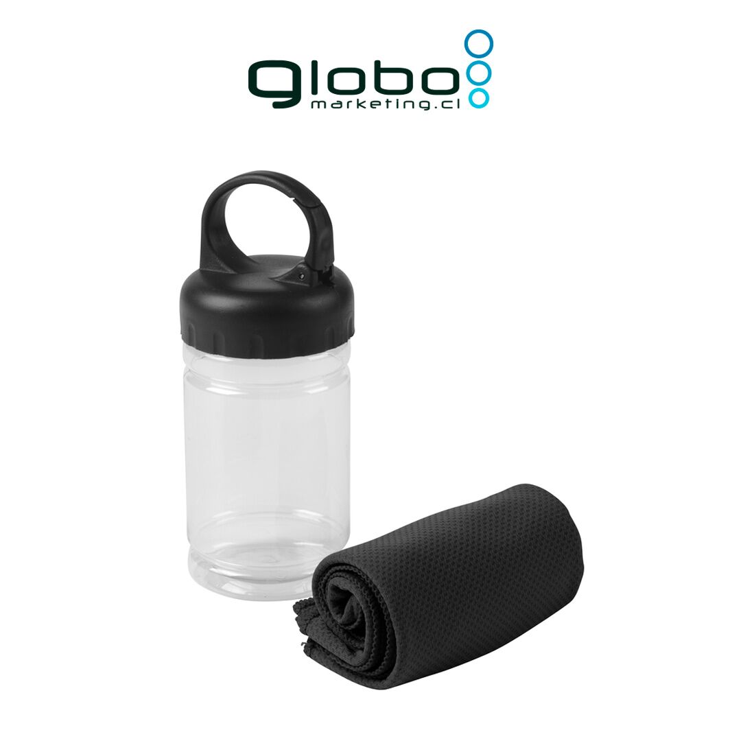 Medidas toalla 79 x 29 cm / Medidas frasco: Ø6,5 x 17 cm. Políester. Toalla de enfriamiento en un estuche de plástico transparente. Para un efecto refrescante humedezca la toalla con agua o agregue agua en el cilindro e incorpore la toalla. Tapa a rosca con mosquetón.