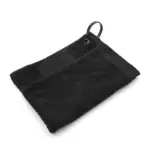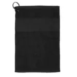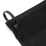 Toalla negra para golf con ojal colgante. Fabricado en algodón de 400 gramos por metro cuadrado. Cuenta con ojal metálico con cordón para colgar y franja decorativa central. Es ideal para secar manos, pelotas o palos durante el juego, manteniendo todo limpio y funcional. Tahg.