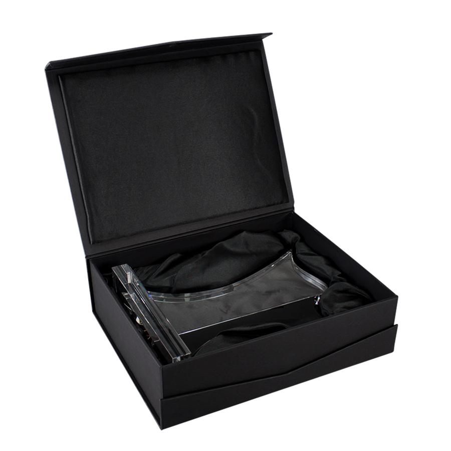 Deluxe Trofeo grande de Cristal modelo “Bauhaus” con aplicación de cristal-color. Presentación en caja de cartón forrado negro.