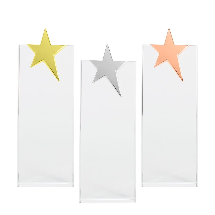 Elegante Trofeo Galvano de Cristal modelo “Ledecky”, con estrella de acero inoxidable de color metalizado en su parte superior. Presentación en caja de cartón forrado negro con cierre imantado, interior acolchado de espuma y tela poliéster satinado negro, con troquel.