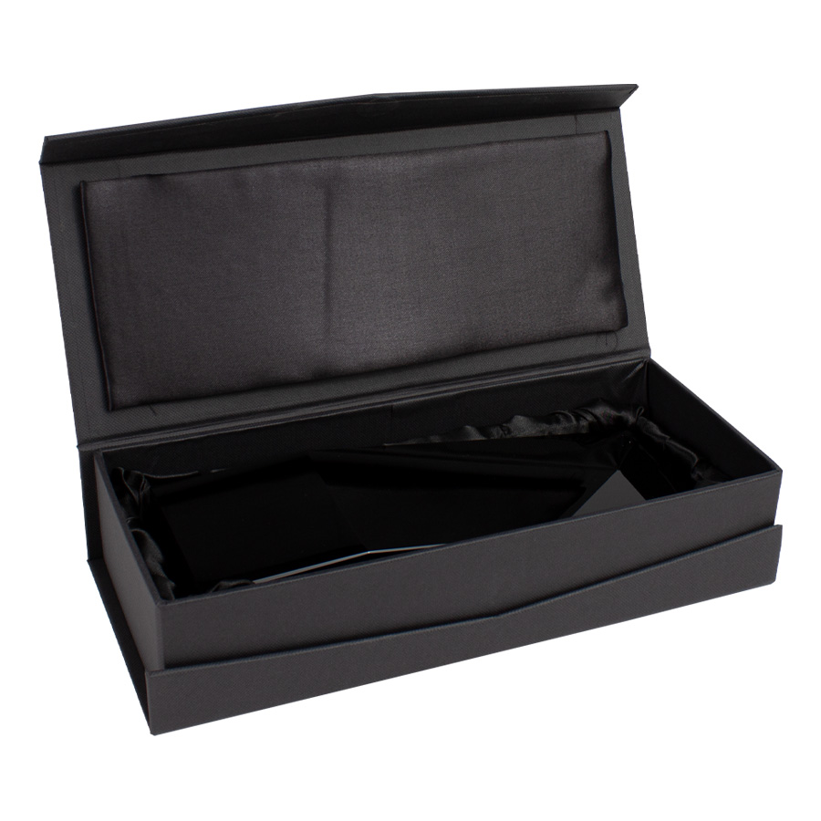 Elegante Trofeo de Cristal Negro, modelo “Azabache”. Presentación en caja de cartón forrado negro con cierre imantado, interior acolchado de espuma y tela poliéster satinado negro, con troquel.