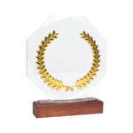 Elegante Trofeo modelo “Phelps”, base de madera barnizada y cuerpo de cristal con hojas de laurel doradas en acero inoxidable. Presentación en caja de cartón forrado negro con cierre imantado, interior acolchado de espuma y tela poliéster satinado negro, con troquel.