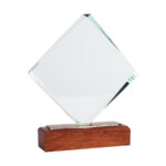 Elegante Trofeo modelo “Fischer”, base de madera barnizada y cuerpo de cristal. Presentación en caja de cartón forrado negro con cierre imantado, interior acolchado de espuma y tela poliéster satinado negro, con troquel.