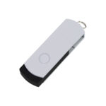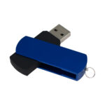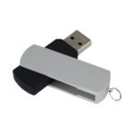 USB Pendrive 2.0 con 32GB de memoria, con cuerpo de silicona negra y carcasa metálica de giro de color, removible. Presentación en estuche de PVC translúcido.