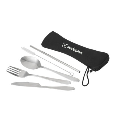 Elementales siempre a manoSet de cubiertos. 5 elementos:  Cuchara, tenedor y cuchillo en acero 430; Bombilla y cepillo para bombilla